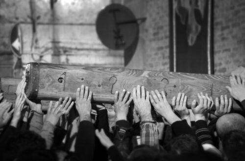 Oggi ci spostiamo da un’altra parte dell’isola. Ci sono due processioni del Cristo Morto ad Augusta. Una è alla luce del Sole, l’altra alla luce della Luna che, piena, ci annuncia che qualcosa sta cambiando nell’universo e che tra poco sarà Pasqua. Le prime luci dell’alba colorano l’antico centro storico. Dalla chiesa di San Giuseppe esce il Cristo Morto portato dai confrati che vestono un abito penitenziale di foggia spagnolesca. Una folla immensa assiste silenziosa. Il Figlio di Dio qui è il figlio di ogni donna, e, nel giorno della sua morte e del suo funerale, è adagiato in un letto di purpuree camelie e viene portato in questa rituale…